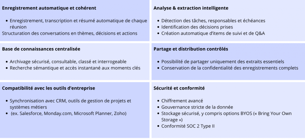 Meeting Insights vise à aider les organisations à mieux documenter, accélérer la prise de décision et centraliser le savoir collectif, grâce à une IA de niveau entreprise.
